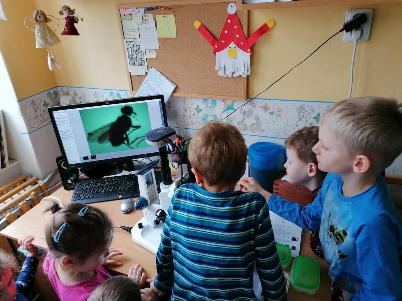 Největším lákadlem byl ale bezesporu mikroskop, který je možno propojit s interaktivní tabulí i počítačem. Děti si prohlédly detailní stavbu rostlinných i živočišných vzorků a žasly, jak jsou zvětšené objekty zajímavé, mnohdy až strašidelné.